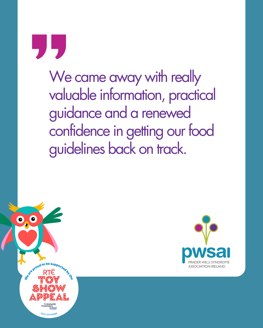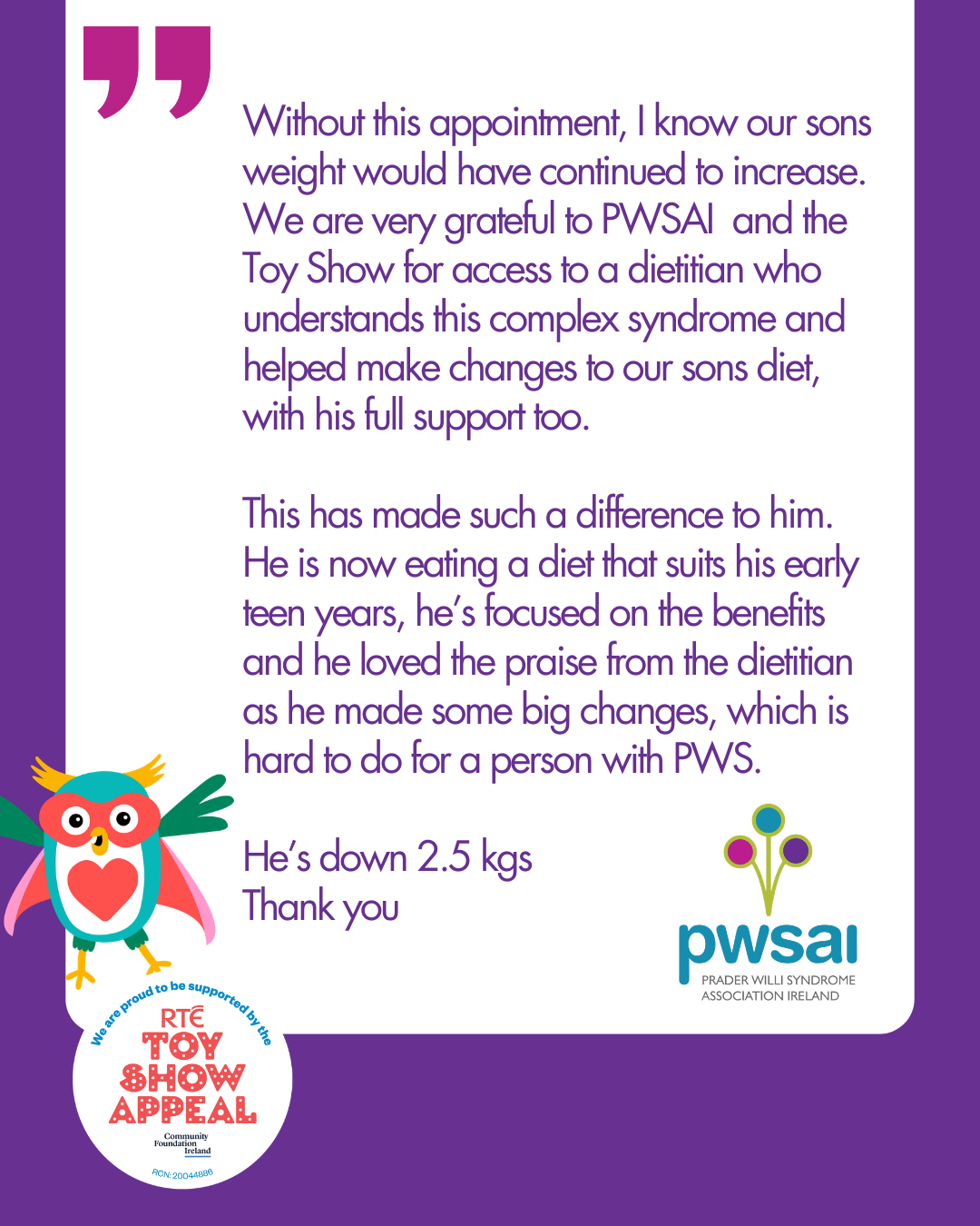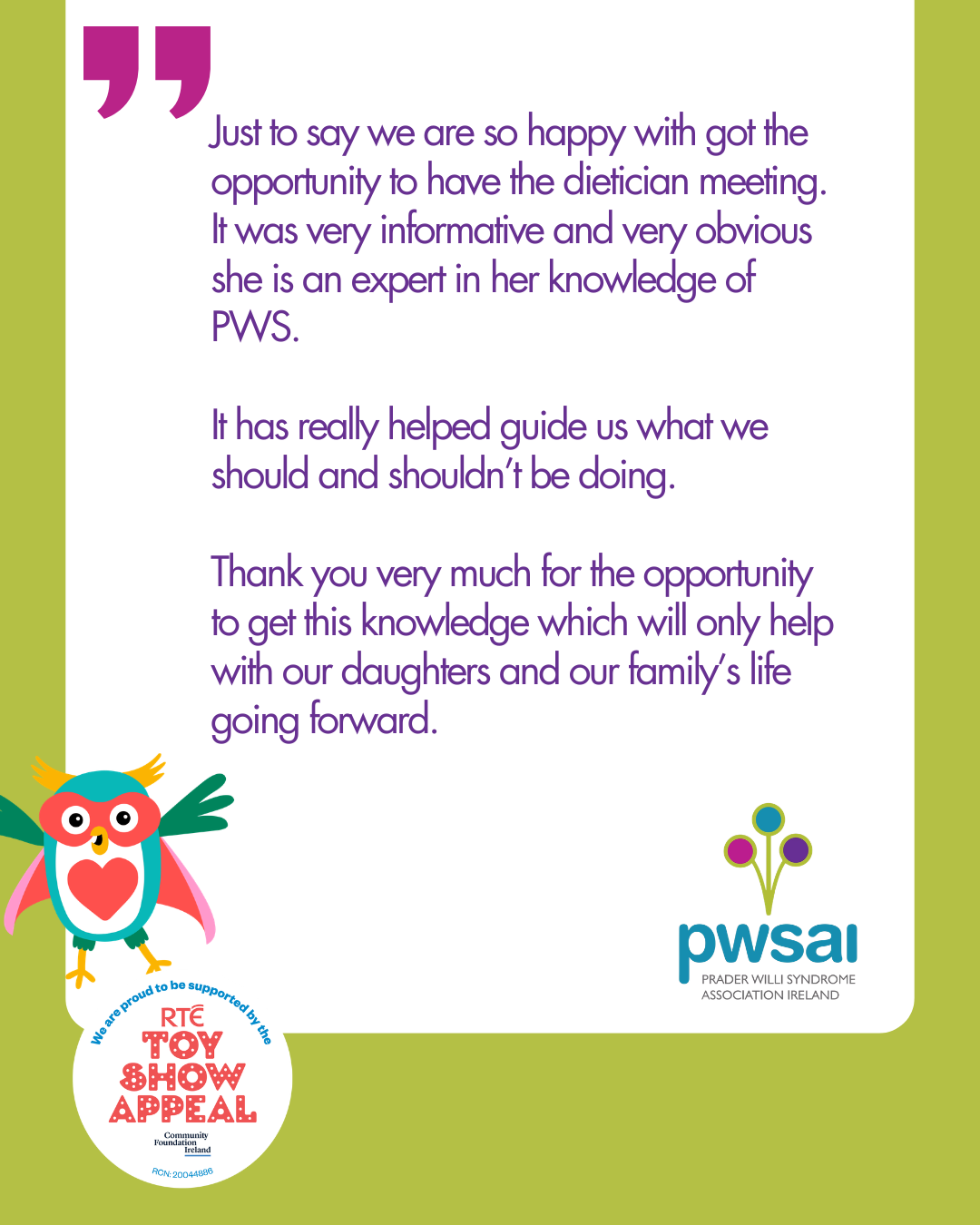 This service is open to all people with PWS in Ireland. PWSAI, with the support of the RTE Toy Show Appeal will fund two sessions with a dietitian who understands PWS.
