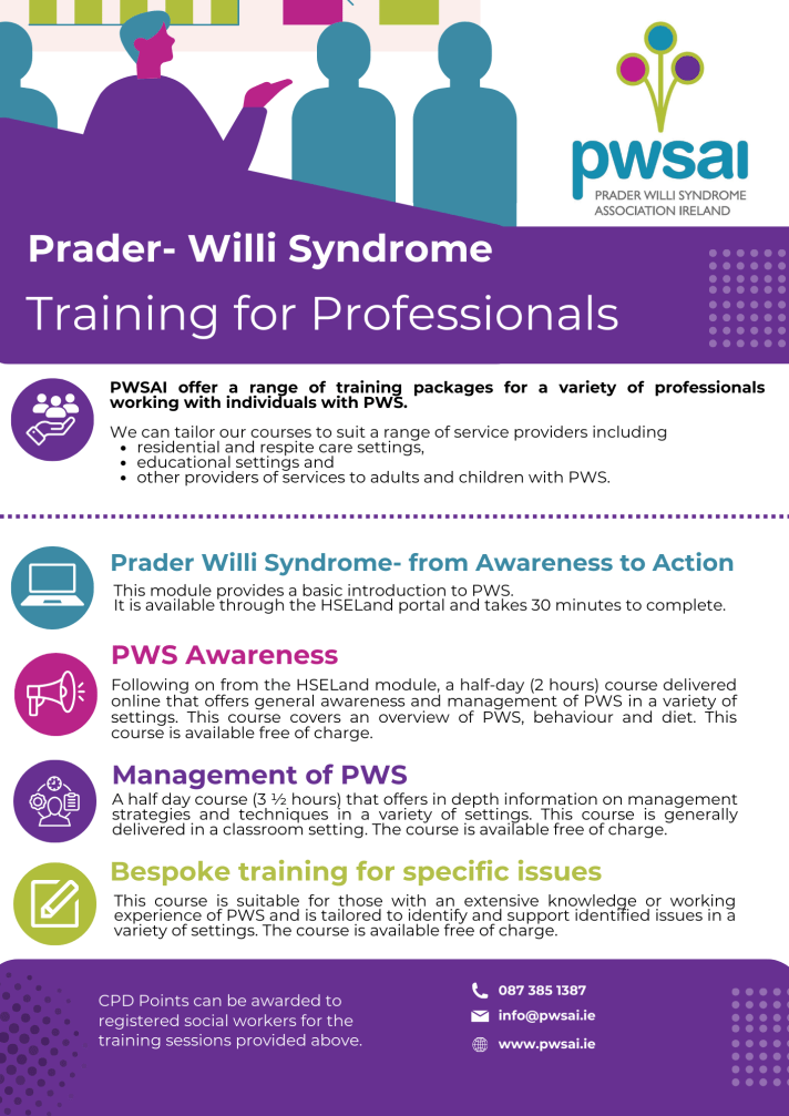 Gary Brennan, National Development Manager can provide specific PWS training for service providers, educators and professionals supporting people with PWS