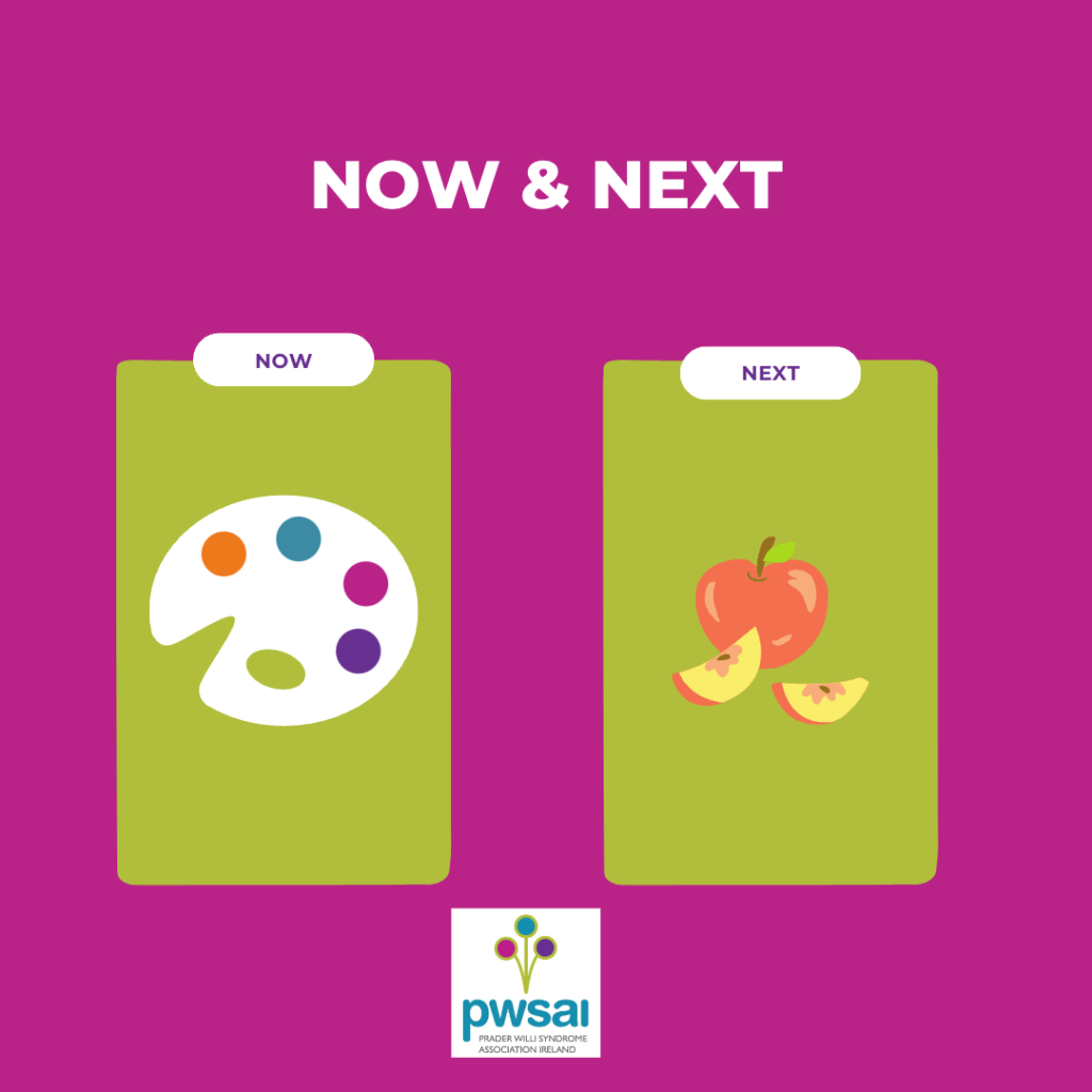 A “Now and Next” chart supports a person to understand what will be happening and the order that this will happen.